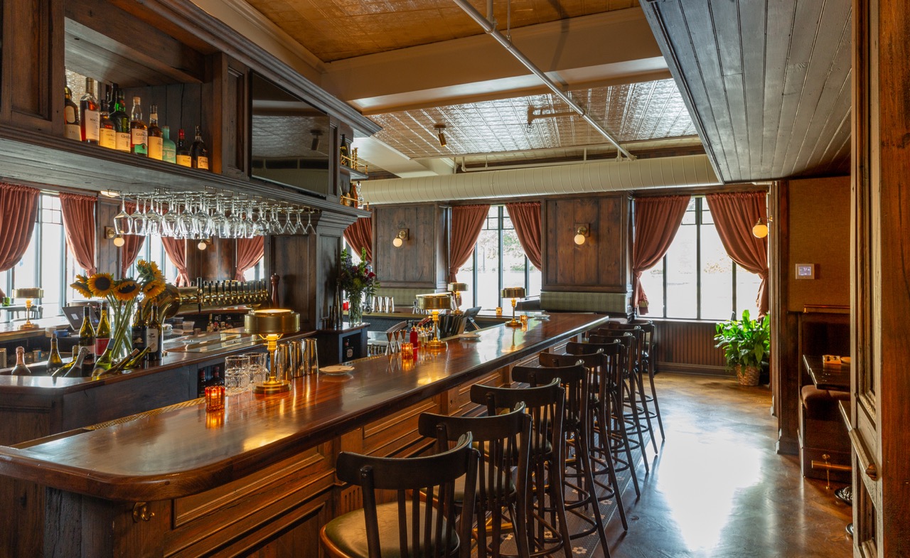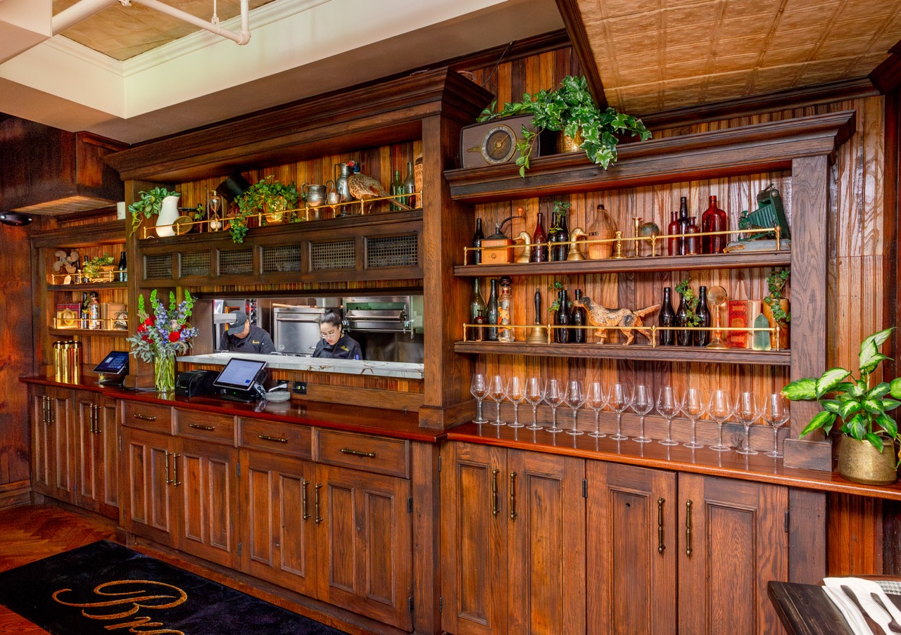 Reclaimed wood millwork - Bar face and Back Bar, wall paneling, wainscoting, Kitchen wood counter, Service Station Cabinetry, second floor private dining room bar, back bar, wall paneling and wainscoting.