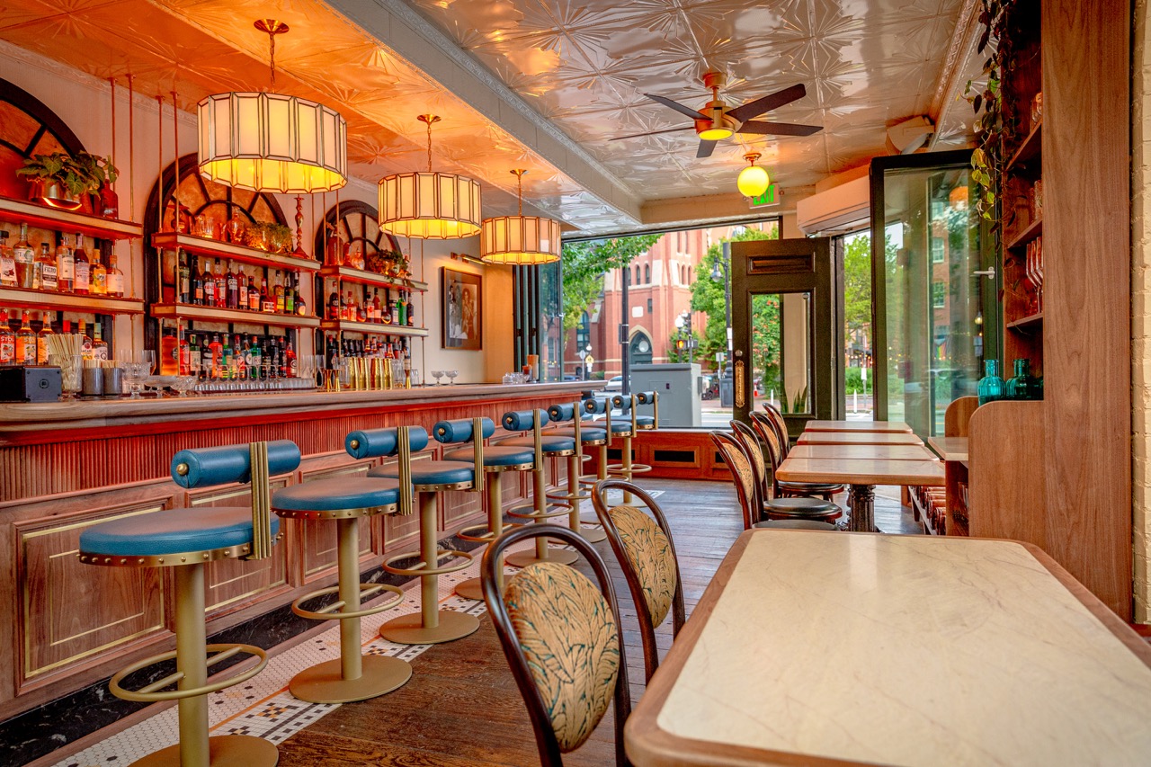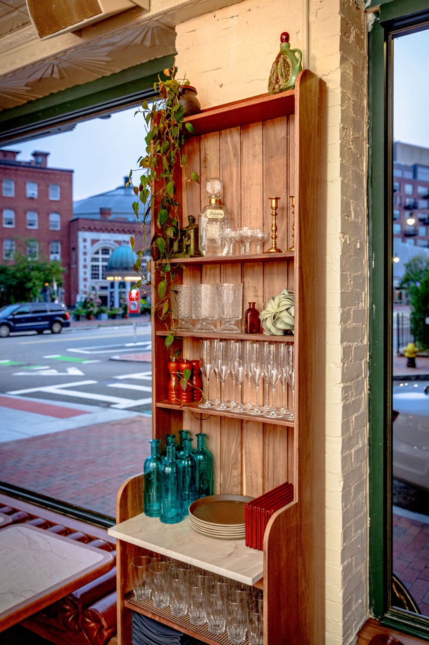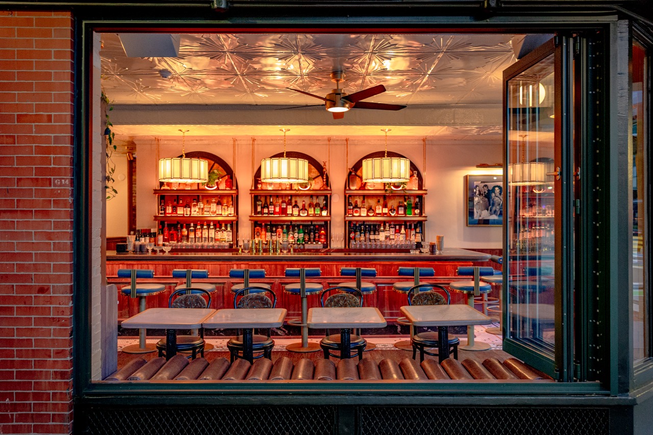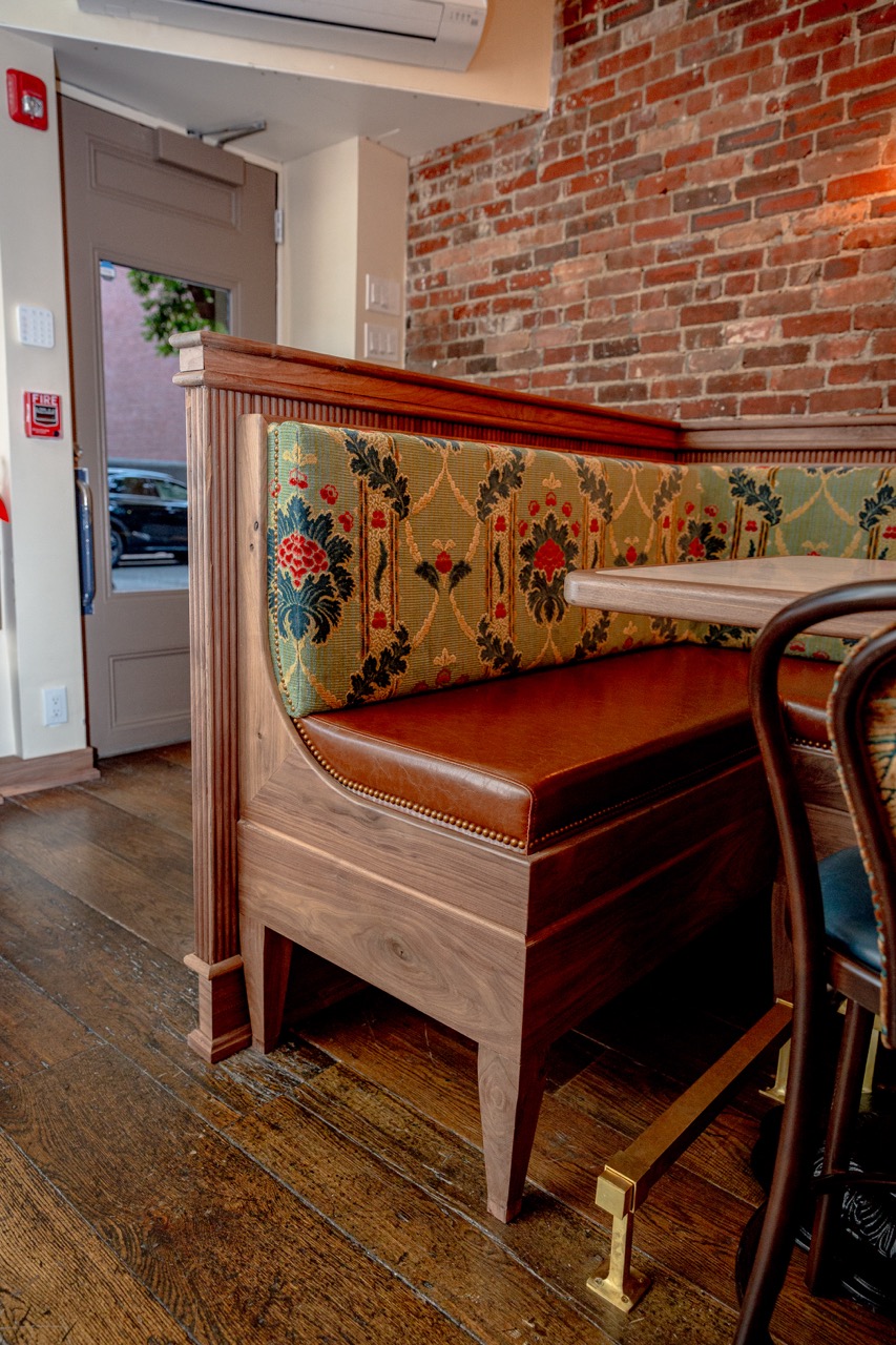 Walnut and brass millwork - Bar face and Back Bar, wall wainscoting, walnut banquettes, service station cabinetry.